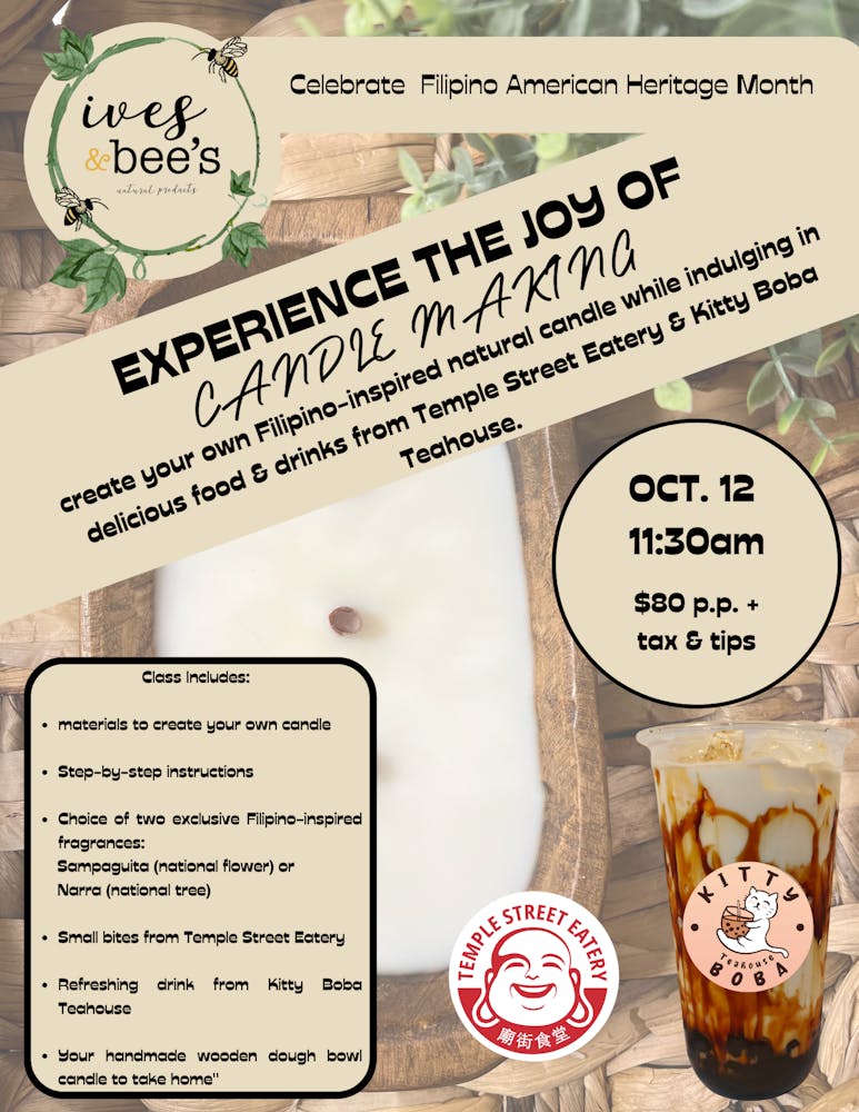 Join us for a unique and immersive experience where you'll craft your own natural candle inspired by the warmth and beauty of Filipino culture. Savor delicious food and drinks from Temple Street Eatery and Kitty Boba Teahouse as you work on your custom candle. Watch as your creation sets, filling the air with a gentle, soothing glow.